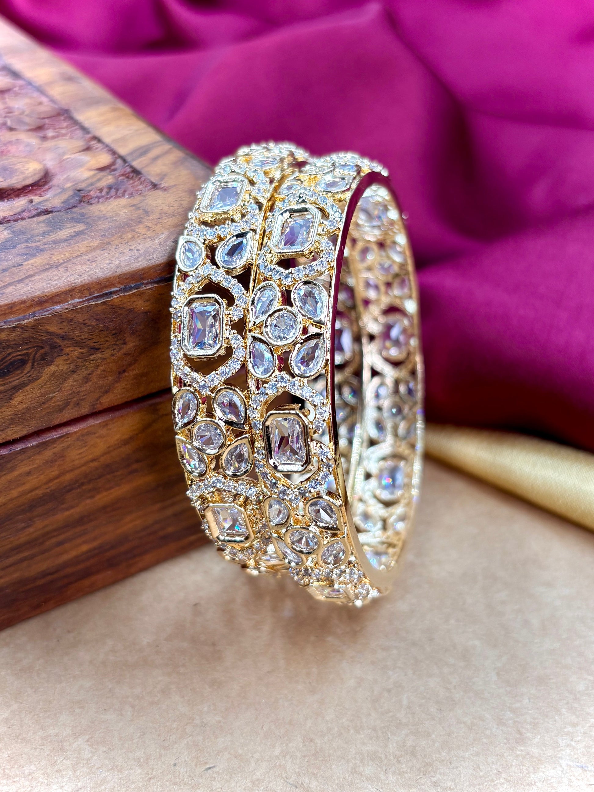 Elevate your jewelry collection with these exquisite Gold AD Designer Bangles, crafted to reflect timeless beauty and luxurious sparkle. Adorned with high-quality American Diamonds (AD stones), these bangles offer the brilliance of real diamonds combined with an elegant gold finish.