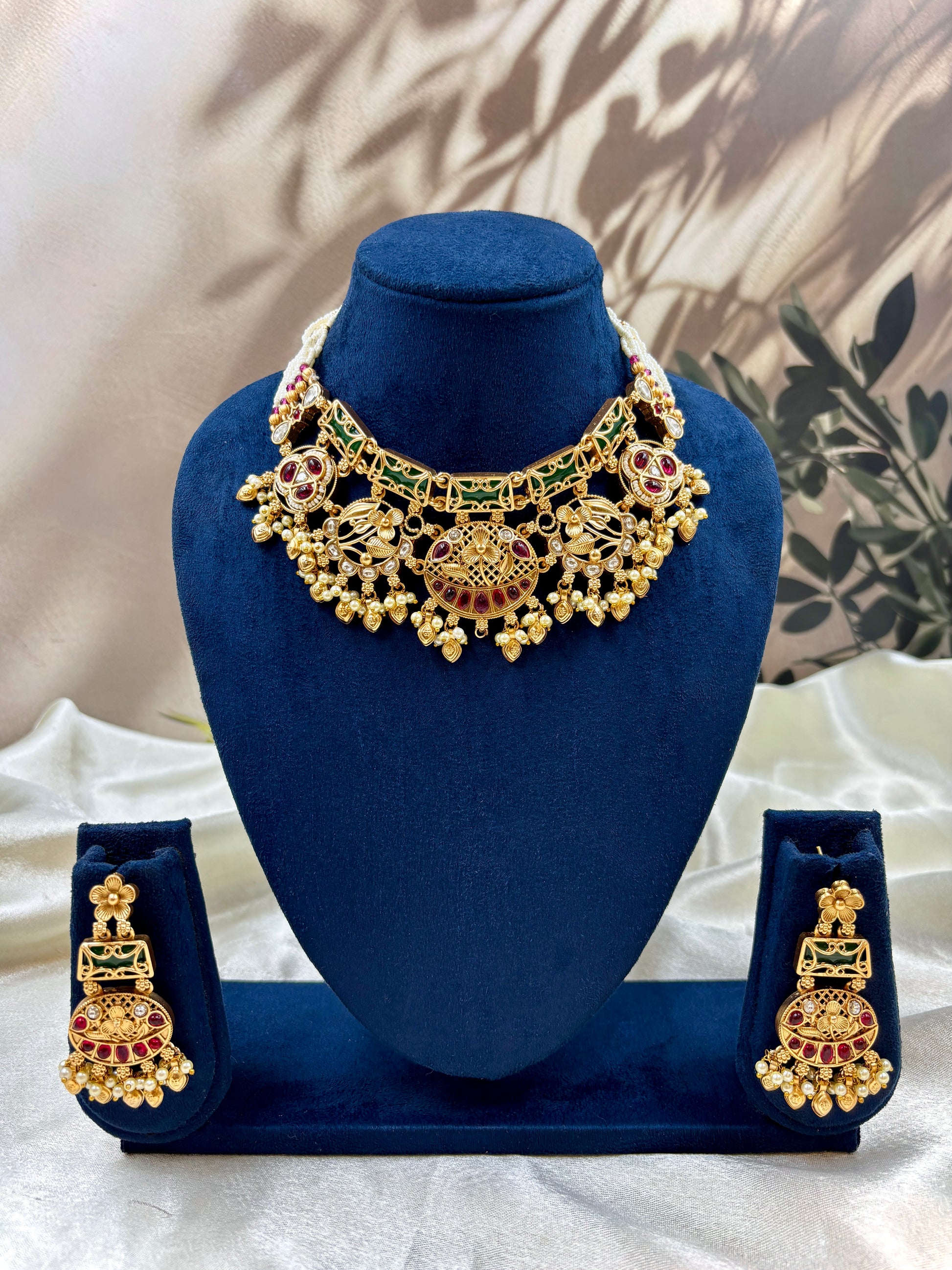 The set includes a beautifully layered choker paired with matching earrings, designed to perfectly complement bridal lehengas, sarees, or couture gowns. Its antique gold finish enhances the brilliance of the stones, giving it a rich, opulent look that exudes sophistication and heritage.