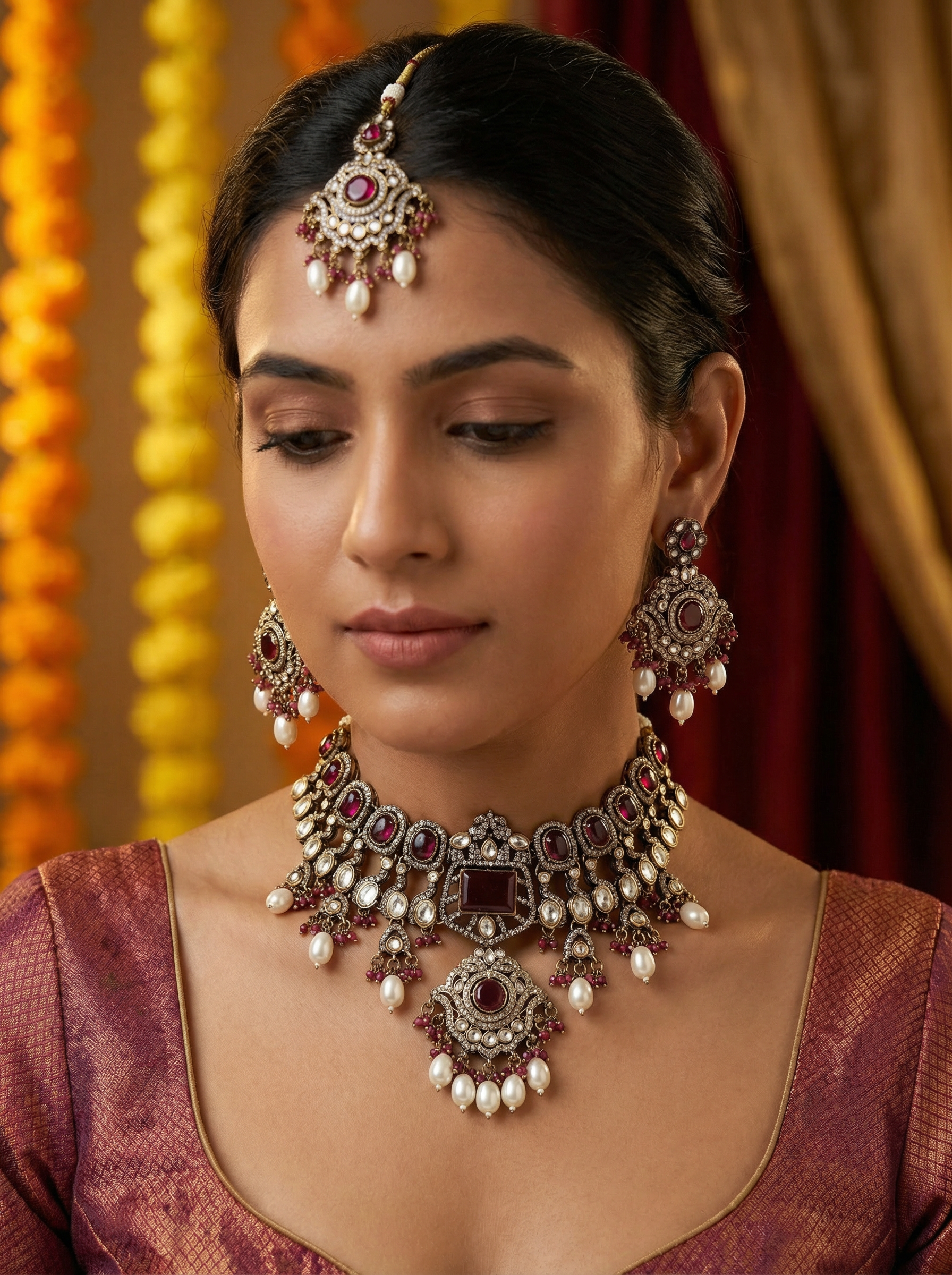 Whether styled with a pastel gown, evening dress, or bridal ensemble, this Ruby Rani Victorian Necklace adds a touch of vintage sophistication and timeless elegance to your look.