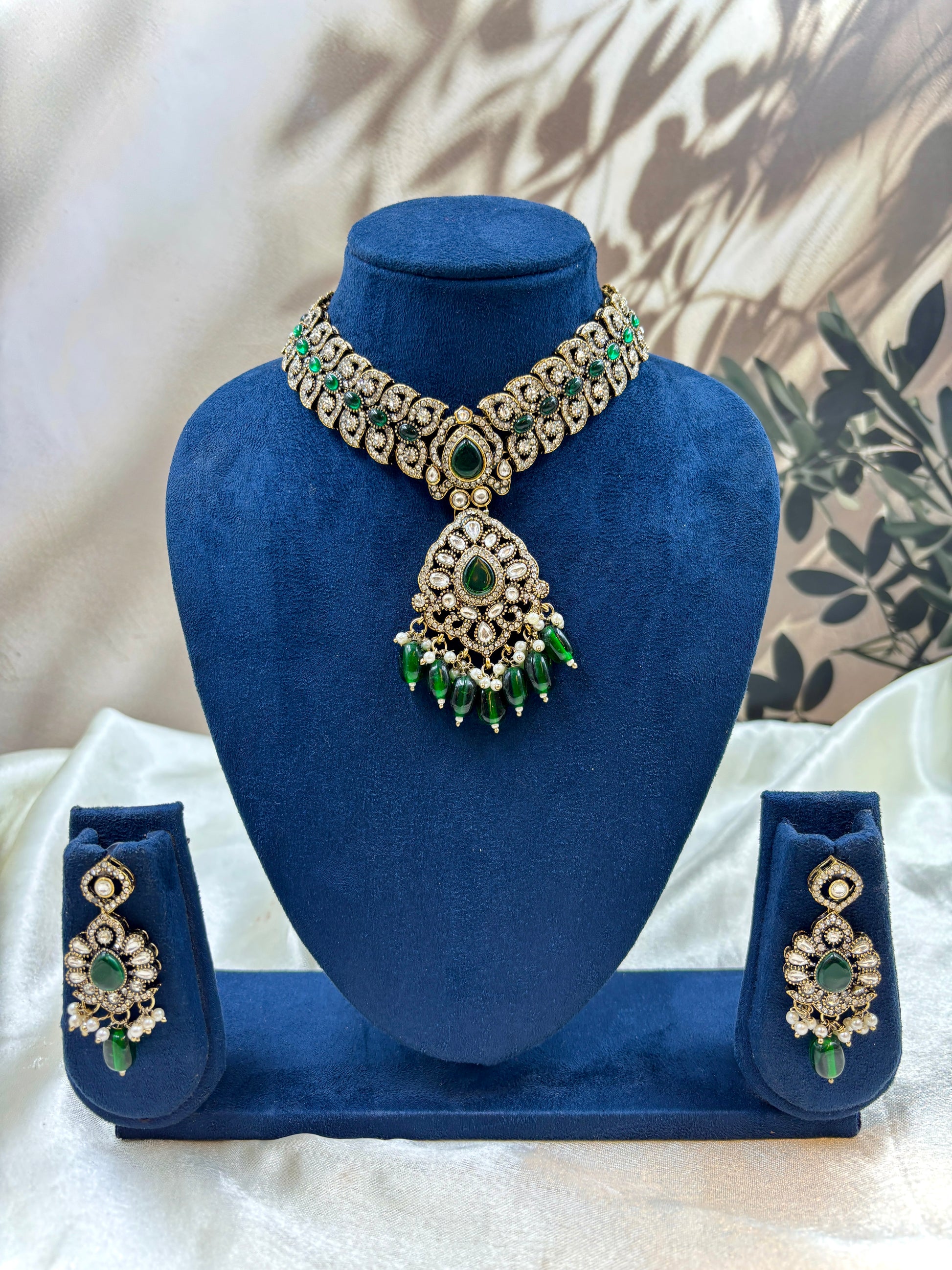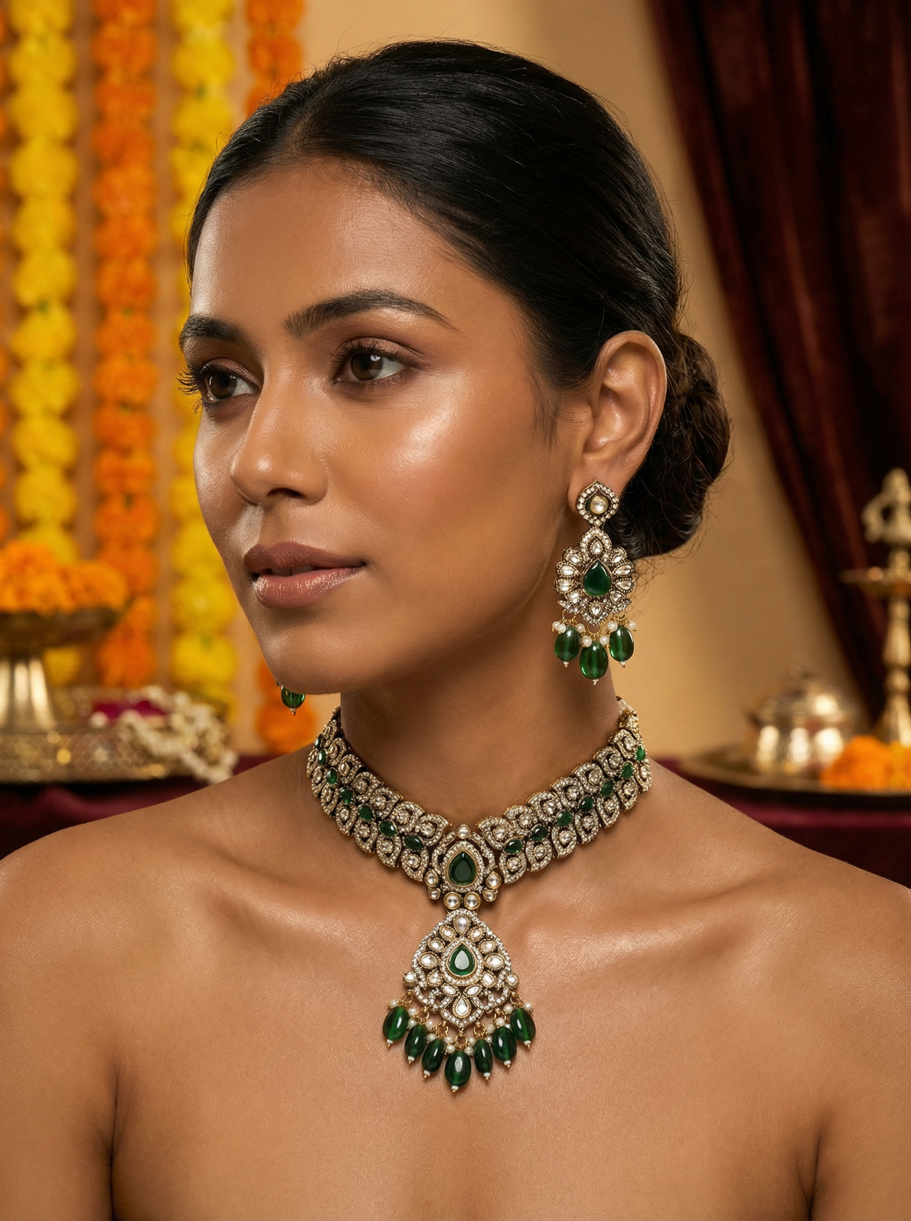 The choker's compact design sits gracefully on the neck, accentuating your neckline with its ornate beauty. Ideal for brides, bridesmaids, or anyone seeking to add a vintage charm to their outfit, this necklace pairs beautifully with traditional sarees, lehngas, or ethnic dresses.